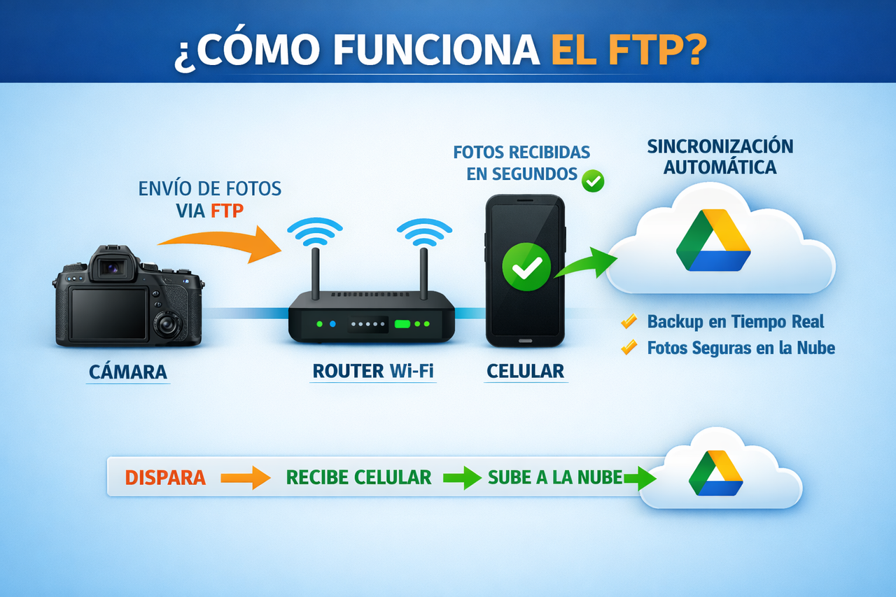 En este artículo te explico qué es el protocolo FTP, para qué sirve, por qué usarlo conectado al celular marca la diferencia, y cómo lo aplico en eventos reales utilizando cámaras Sony para descargar, respaldar y proyectar fotos en tiempo real.